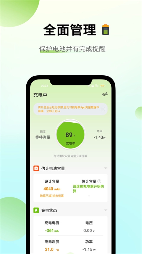 3、电量监控:提供剩余电量使用时间预测,以及各单项功能的预测时间,让用户准确预估电池可用时间。