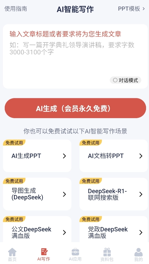 2、点击底部的AI写作功能,内部有很多的写作模版
