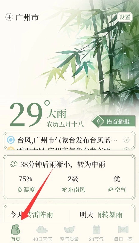 1. 进入杏雨天气预报软件的首页,系统会自动呈现所在地的实时气象信息。该软件具备语音播报功能,方便用户随时收听。