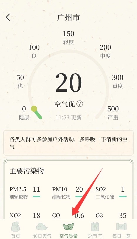 3、用户只需切换到空气质量板块,即可实时查看所在区域PM2.5、空气质量指数等各类精准环保数据。