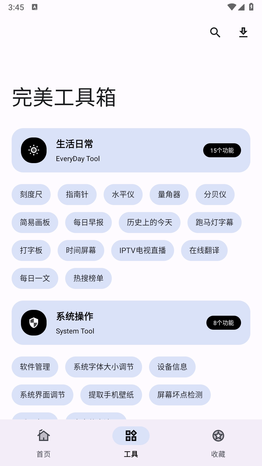 3. “工具”页面把功能做了细致的归类,涵盖生活日常类、系统操作类以及图片相关等类型。