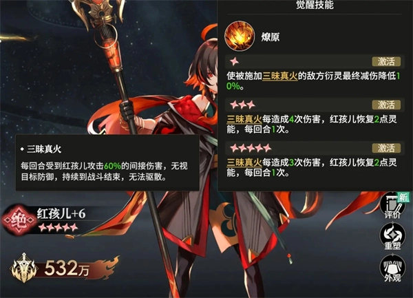 分析:红孩儿和陈奇可以给敌方施加灼烧状态,九头蛇给敌人加的衰竭debuff,铁扇公主可以触发灼烧,每回合敌方都会因为debuff失去大量生命值,队伍主c为红孩儿