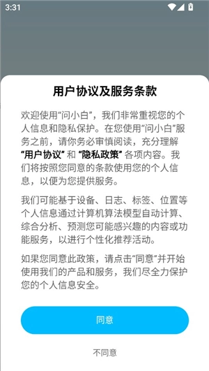 1、在本页面下载问小白app然后打开,先同意用户协议