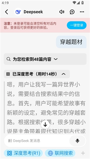 R1具备推理画图功能,支持暗黑模式,拥有深度思考能力,可进行图片分析、文件解析,还设有玩法社区。