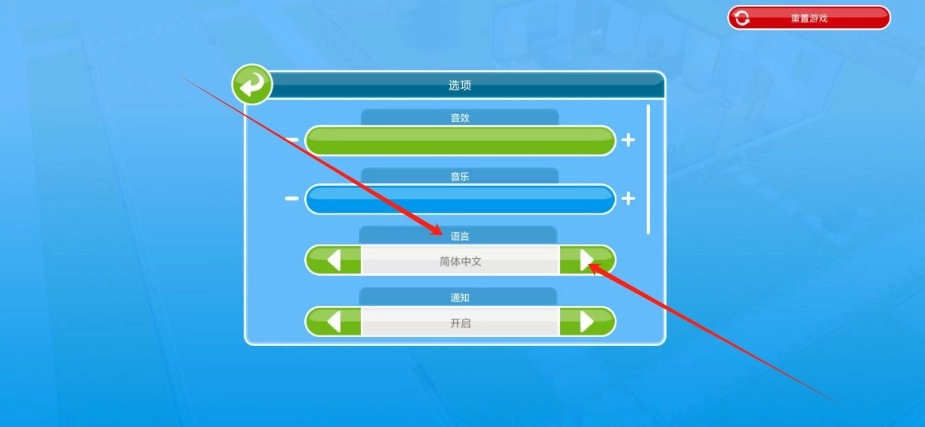 3、最后玩家直接在选项页面中的语言中,点击左右两次的按钮,选择中文即可。