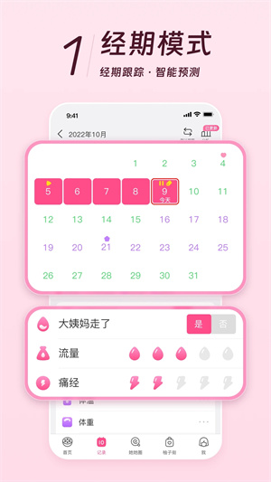 1、贴心预测,及时提醒月经期:女生的贴身健康管家,记录、预测、提醒,一应俱全,让你避免忘记经期的尴尬,记录你每天的心情、健康细节,帮助你养成良好的生活习惯,让你随时了解自己的生理状况。