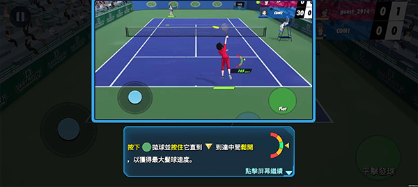 4、当削球按钮出现时,即可按下平击按钮进行蓄力,待蓄力满格后松开,此时便能击出速度最快的网球。
