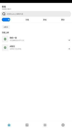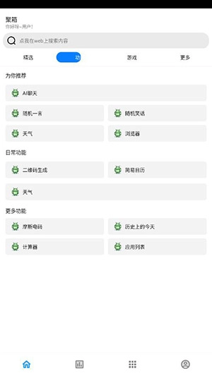聚箱APP是一款安卓手机工具箱软件,该软件内有海量工具供大家使用。目前版本处于内测阶段,不少功能暂时无法实现,还请大家耐心等待后续更新。不过,像小游戏、计算器、时钟等一些小功能,依旧能够正常使用。