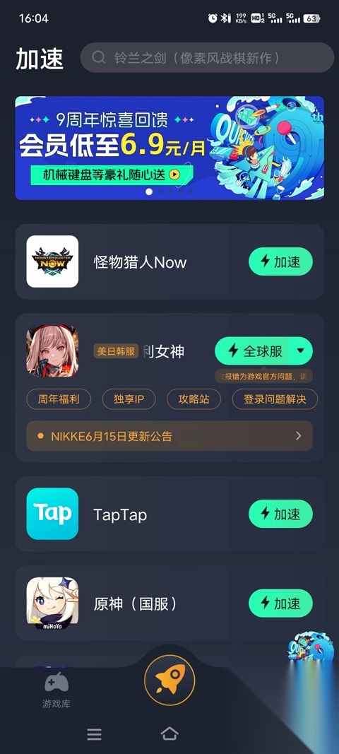 1. 先在本站下载并安装怪物猎人Now官方版本,接着打开奇游手游加速器,于其中找到这款游戏,点击右侧的加速按钮。