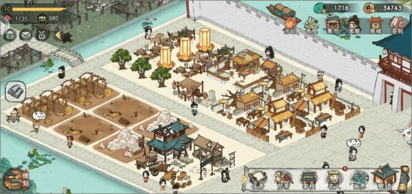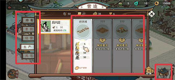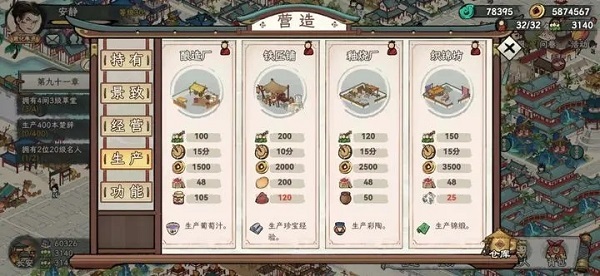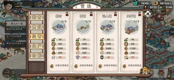 经营类建筑具备这样的功能:能够把玩家手头的物资兑换成通宝,通过这种方式获取利润后,又可将其再次投入生产,如此一来,生产经营便形成了一个闭合循环。具体流程为,先使用通宝生产食物,以食物作为吸引条件召集人口来生产初级产品,初级产品经过深加工进一步得到高级产品,而高级产品经由经营类建筑售卖后又转化为通宝。所以,当玩家缺少通宝时,多建造几个经营类建筑通常是不会出错的选择。