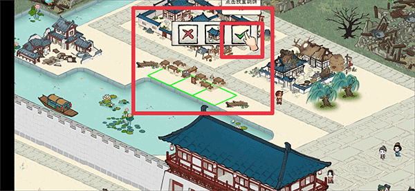 4、接着将选择后的建筑放置在空地上,当颜色变为绿色则代表可以放置,点击勾放置即可
