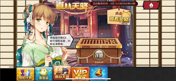福利活动,会不定期为大家开放,每天可许愿三次,许愿可获得精炼石、金坷垃等道具,连续许愿9次可获得大量仙豆,中断会清零,各位小伙伴注意不要断签哦~