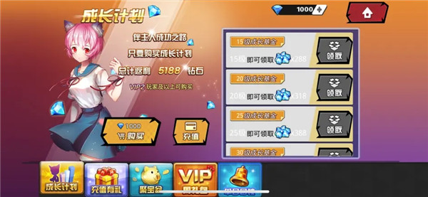 只需投入1000钻石,就能获得总计5188钻石的回报,这绝对是一笔只赚不赔的好买卖,谁又能抵挡“成长计划”的吸引力呢?不过,小编建议大家等到游戏等级达到25级时再购买,这样花费的1000钻石能够立即回本,剩下的4194钻石则可以随着等级的提升逐步领取。