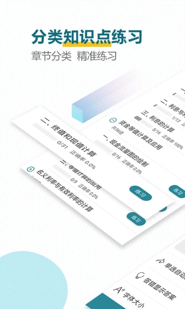 2. 题目根据考试科目、章节分类,方便用户有针对性的学习和复习。