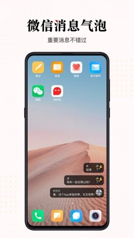 1除上述功能外,微泡泡对讲机具备便捷的快捷手势操作,上滑即可清除,下滑能够进入,点击就能回复,手势操作简单迅速。不仅如此,它还提供多款消息气泡样式供你挑选,并且支持DIY透明度设置,使你的聊天界面更具炫酷感。最后值得一提的是,微泡泡对讲机拥有全局消息气泡功能,无论处于何种界面,只要收到微信消息,消息气泡便会出现,助你快速查看并回复。