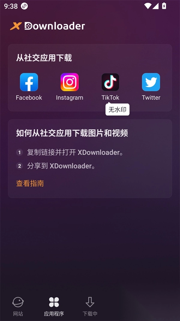 2、借助“应用程序”功能,我们能够获取Instagram、TikTok、Twitter等多款app上的视频资源。