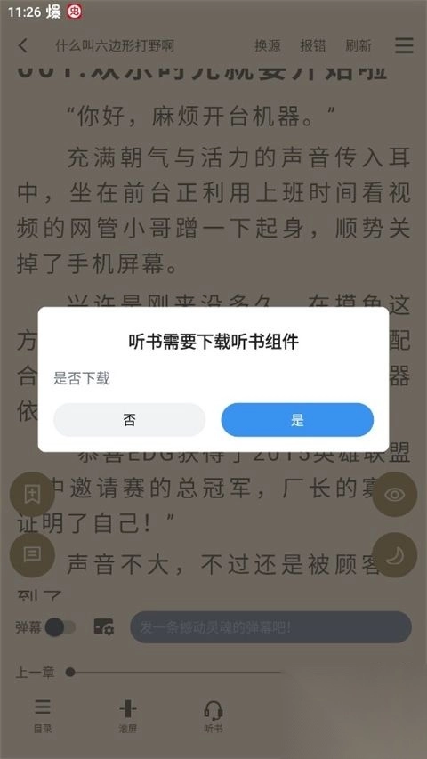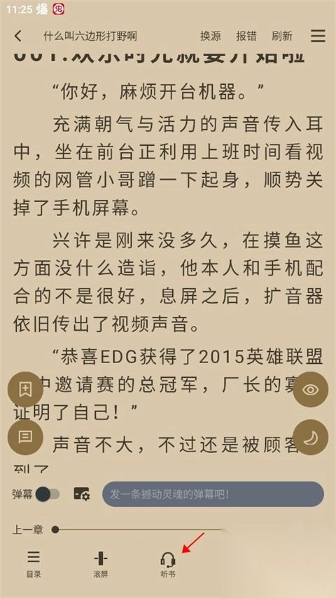 1、进入到小说阅读界面,轻点屏幕唤起菜单,点击下方的听书选项。
