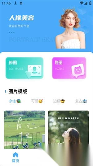 1. 当您进入首页时,能够看到修图与拼图这两项功能,只需点击即可进入使用。