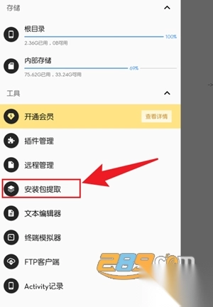 打开MT管理器,点击左上方的【三条线】,点击【安装包提取】