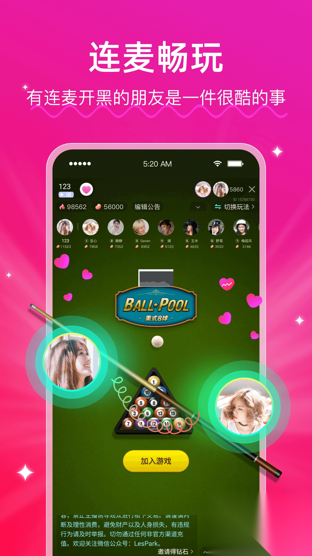 3. 趣味游戏来袭:有刺激的桌球排雷,烧脑的谁是卧底,欢乐的你画我猜,还有充满挑战的友尽闯关。各类休闲游戏一应俱全,无论何时何地,都能连麦尽情畅玩!