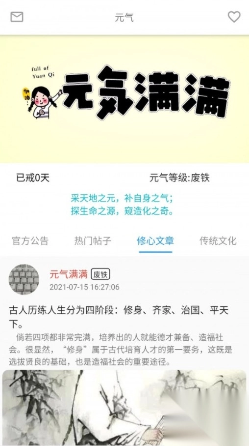2、统文化,体验 交流,以及有关修心的文章和许多其他功能,您还可以在线交流、私信聊天、接收通知;