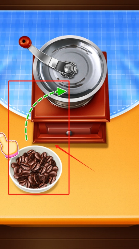 2、看绿色箭头提示,把台面上的咖啡豆倒进木质研磨机里,准备磨咖啡粉。