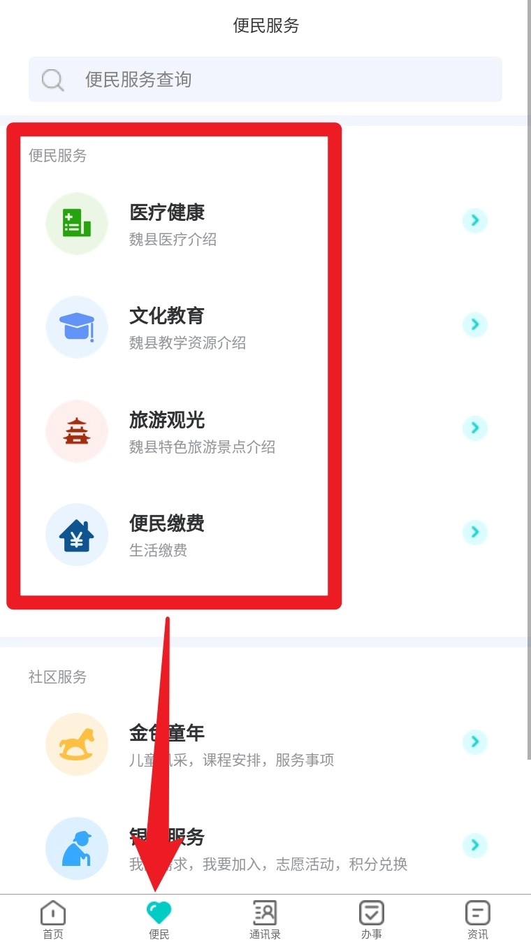 2. 在“便民”页面中找到“便民服务”模块,可查看医疗健康、文化教育等魏县本地服务简介。
