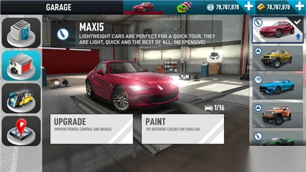 1、打开在本站下载的 进入游戏后,点击上方的汽车图案,玩家可以在右方选择你想要的车辆;