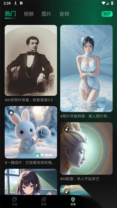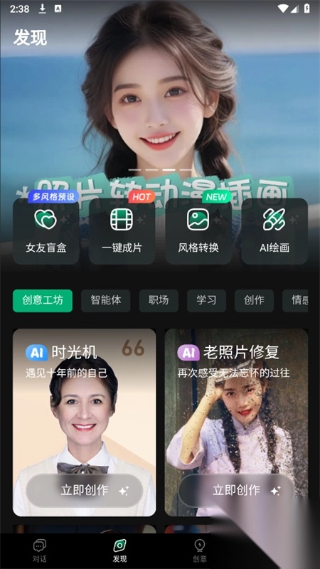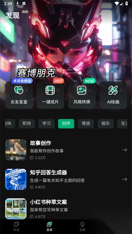 3、在发现页面,为大家提供了AI绘画、AI音乐、一键成品等功能,还可以根据不同场景选择需要的功能