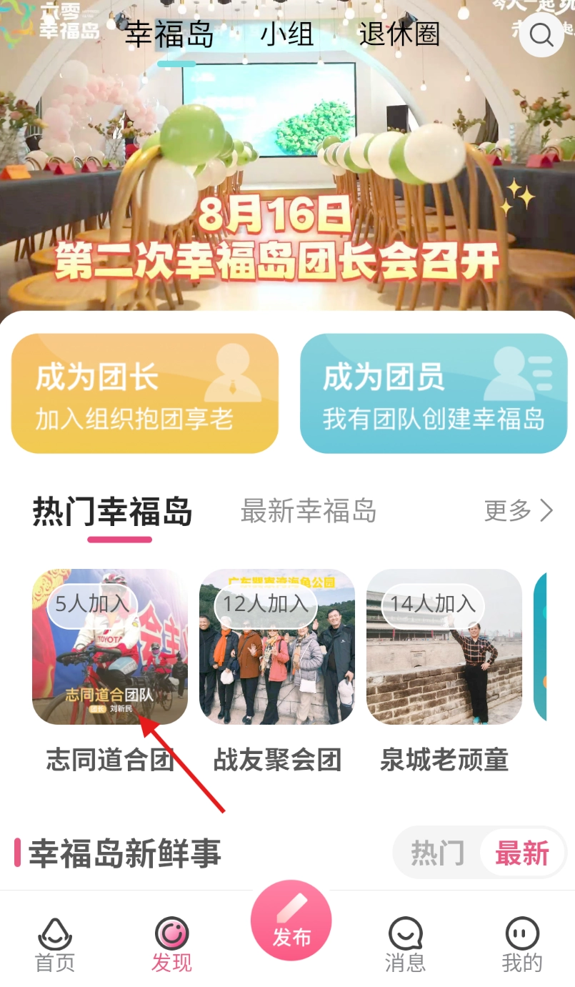 2. 在“发现”页面里,找寻并点击“幸福岛”模块,从而进入相关界面。