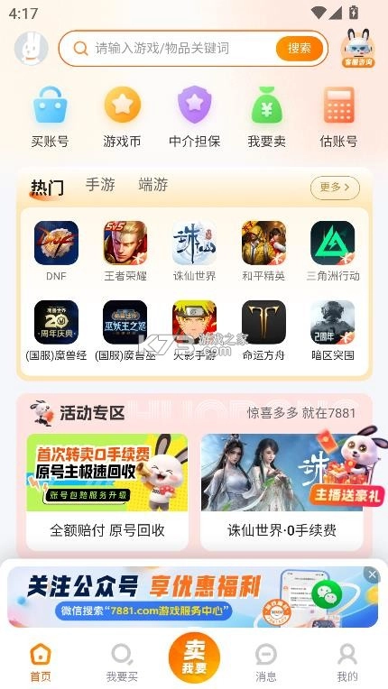 《7881游戏交易平台》是一款专业的网络游戏交易平台,专注于游戏装备、账号、游戏币等虚拟物品的安全交易。平台为玩家提供规范的交易环境,卖家可便捷出售闲置账号,买家也能轻松选购心仪的游戏资产,所有交易均受严格规则保护。