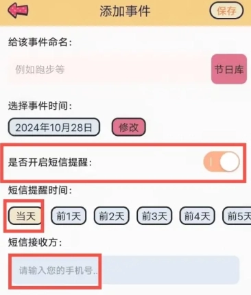 3、进入新建事件的页面,打开【是否开启短信提醒】功能,接着设置提醒时间以及提醒手机号,这样就完成操作了。