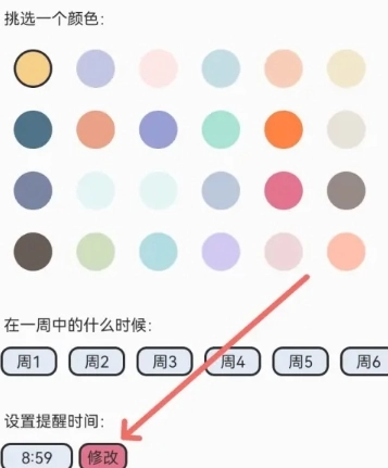2. 在弹出的习惯提醒界面中,寻找到提醒时间区域,轻点修改按键。