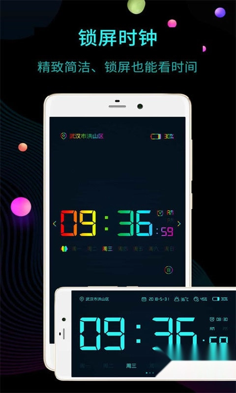 - 全屏时钟:超大模拟时钟、数字时钟全屏显示在手机上,简洁大气。