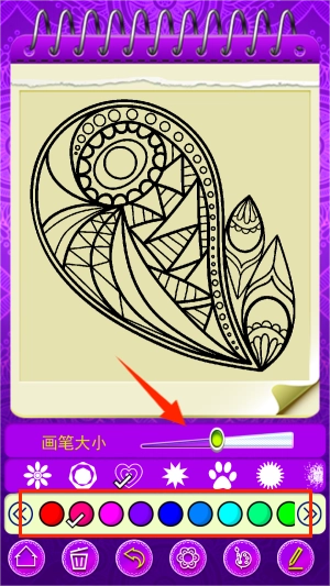 3、届时会呈现出需要涂色的图案,图案下方配备了各类颜色盘,你只需拿起画笔为其填色就行。另外,拖动画笔对应的进度条,还能够对画笔的大小进行调节呢。