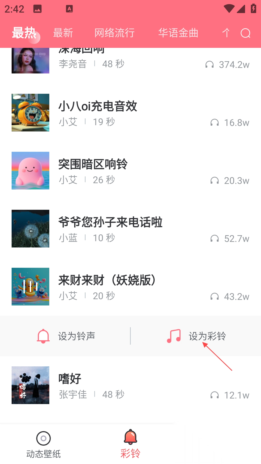 2、打开【彩铃】界面,浏览分类或搜索心仪的歌曲。