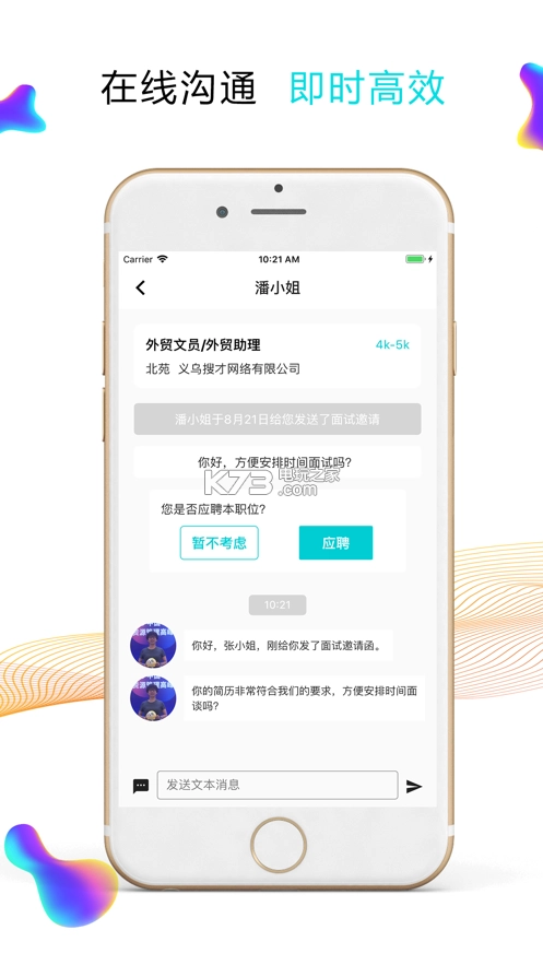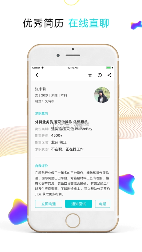 搜才APP,聚焦义乌市场并辐射周边城市,是一款求职招聘一体化的优质APP。它版面设计简约,操作便捷,用户能够极速上手。求职者注册简历轻松一步到位,企业注册后可免费查看普工、技工等相关信息。该APP为企业提供全程精准化的信息服务对接。此外,它还能实现求职者与招聘HR的精准匹配,双方随时随地即可直接开聊,线上约聊后,线下就能快速面试,助力求职者极速入职。