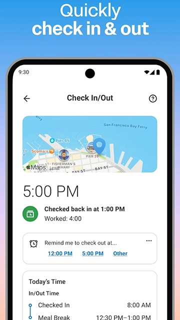 • 可快速进行薪资查看、短期休假的查看或申请、工作打卡,还能提交工时表与费用报销单。