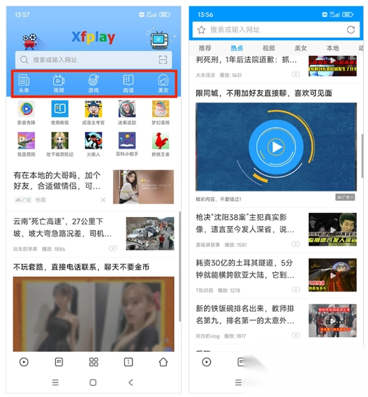 (2)选择【子导航板块】的头条、视频、阅读等按钮,可以进入信息流,浏览热点新闻资讯。