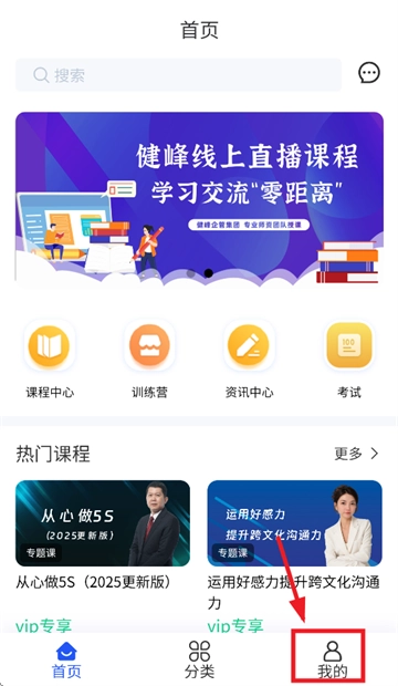 请先下载并安装健峰云课程app,安装完成后打开该应用。进入app首页界面后,点击页面中的“我的”选项。