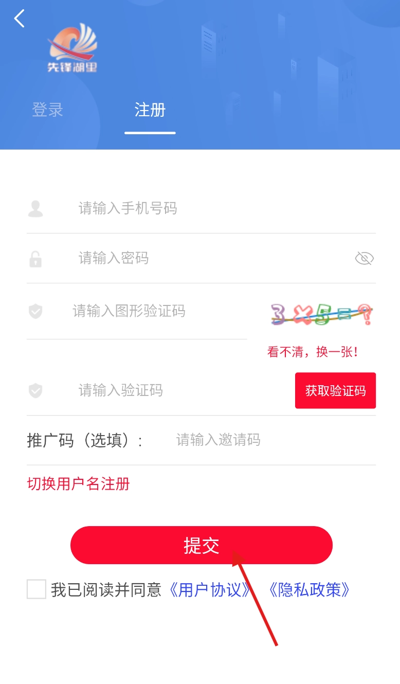 4、在注册界面依次填入手机号、设定密码、输入验证码,仔细检查无误后点击提交完成注册。