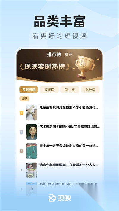 现映短视频APP,这是一款专为安卓手机用户打造的免费短视频观看软件。在这里,用户能够在线浏览到最新、最热门的短视频。软件内短视频品类繁多,题材丰富多样,而且只需输入关键词,就能轻松完成搜索。要是你对这款软件感兴趣,不妨点击下载体验一番!