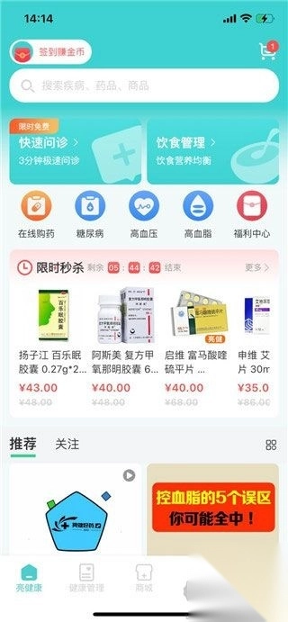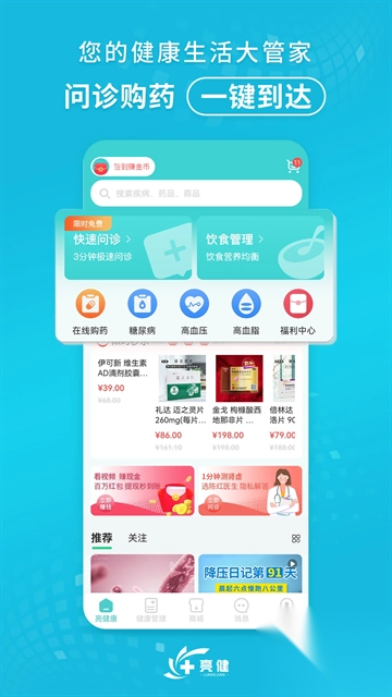 亮健康App堪称一款专业的网上购药利器,是助力你在线购药的得力助手。它为用户精心打造了一系列健康服务,涵盖在线专业医生咨询、线上便捷购药、丰富健康知识分享以及个性化健康管理等。不仅如此,亮健康App还别具匠心地采用拍短视频的形式,为用户构建不同医疗场景下的知识体系,助力用户及时察觉病情、了解病情,从而更深入地知晓自身身体状况。有需求的朋友,赶快下载体验一番吧!