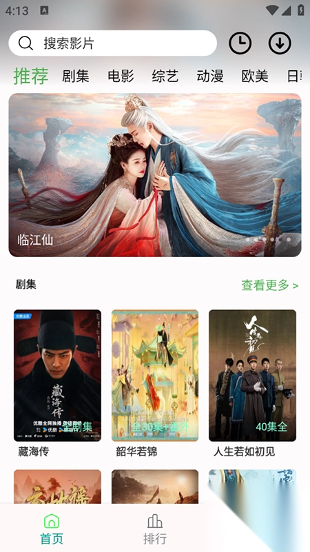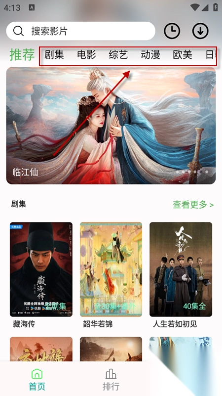 1、打开软件,进入首页,首页展示了推荐的影视资源,包括剧集、电影、综艺、动漫等,点击首页上方的分类标签,可筛选查看该类型的影视资源。