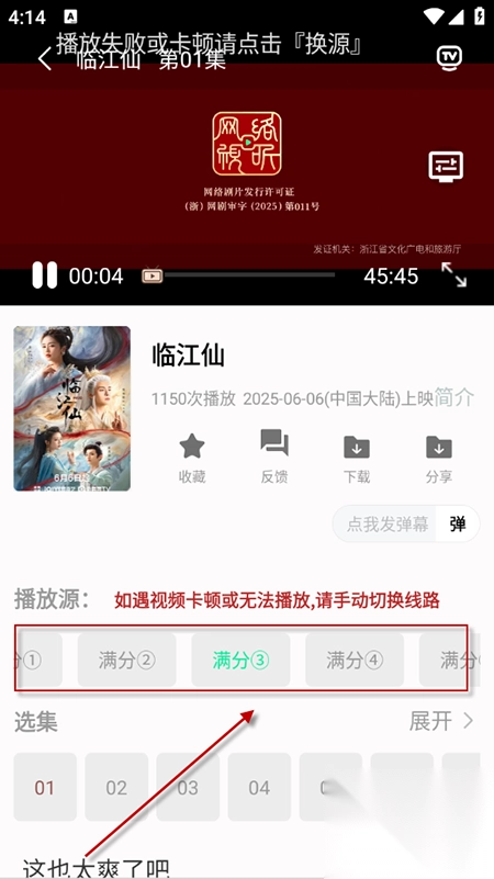 4、找到想看的影视后,点击进入详情页面,选择集数即可开始播放。若播放卡顿或失败,点击“换源”按钮切换播放线路。