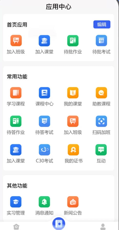 3、在应用中心,能够访问课程、考试、证书等教学功能。