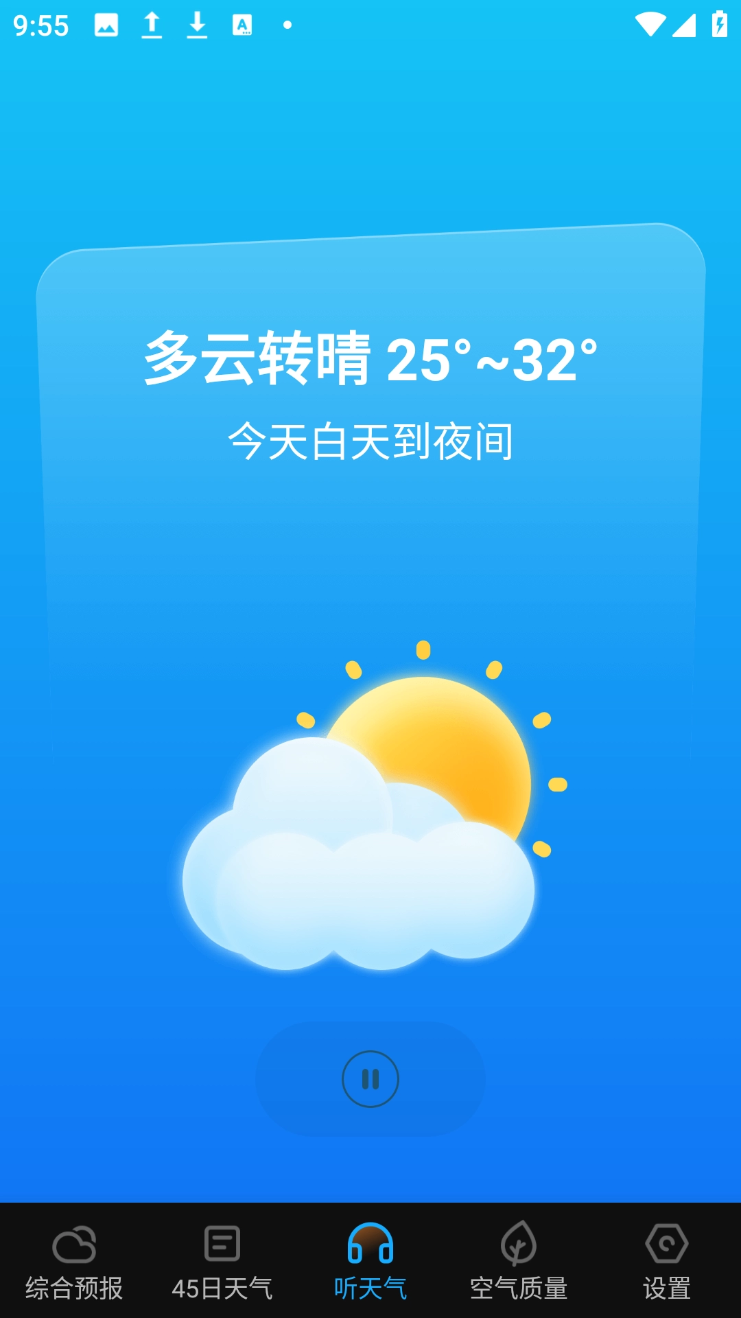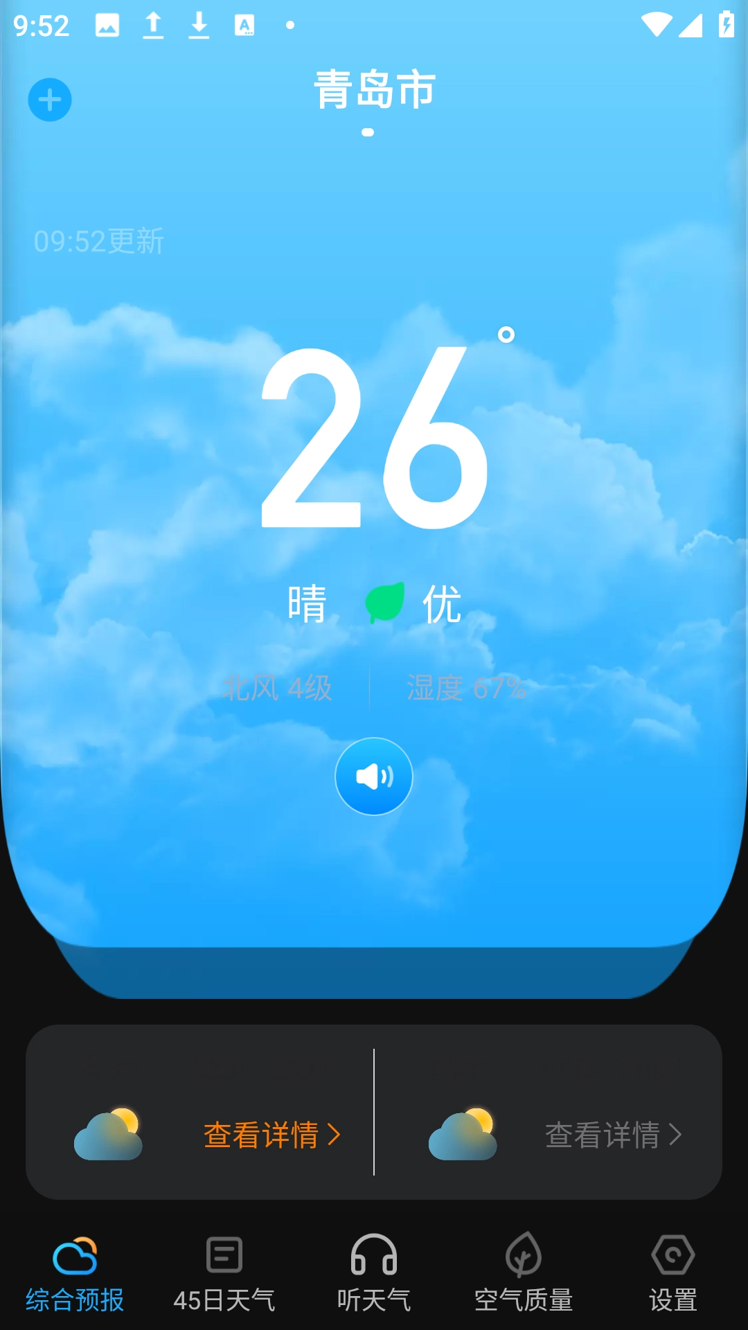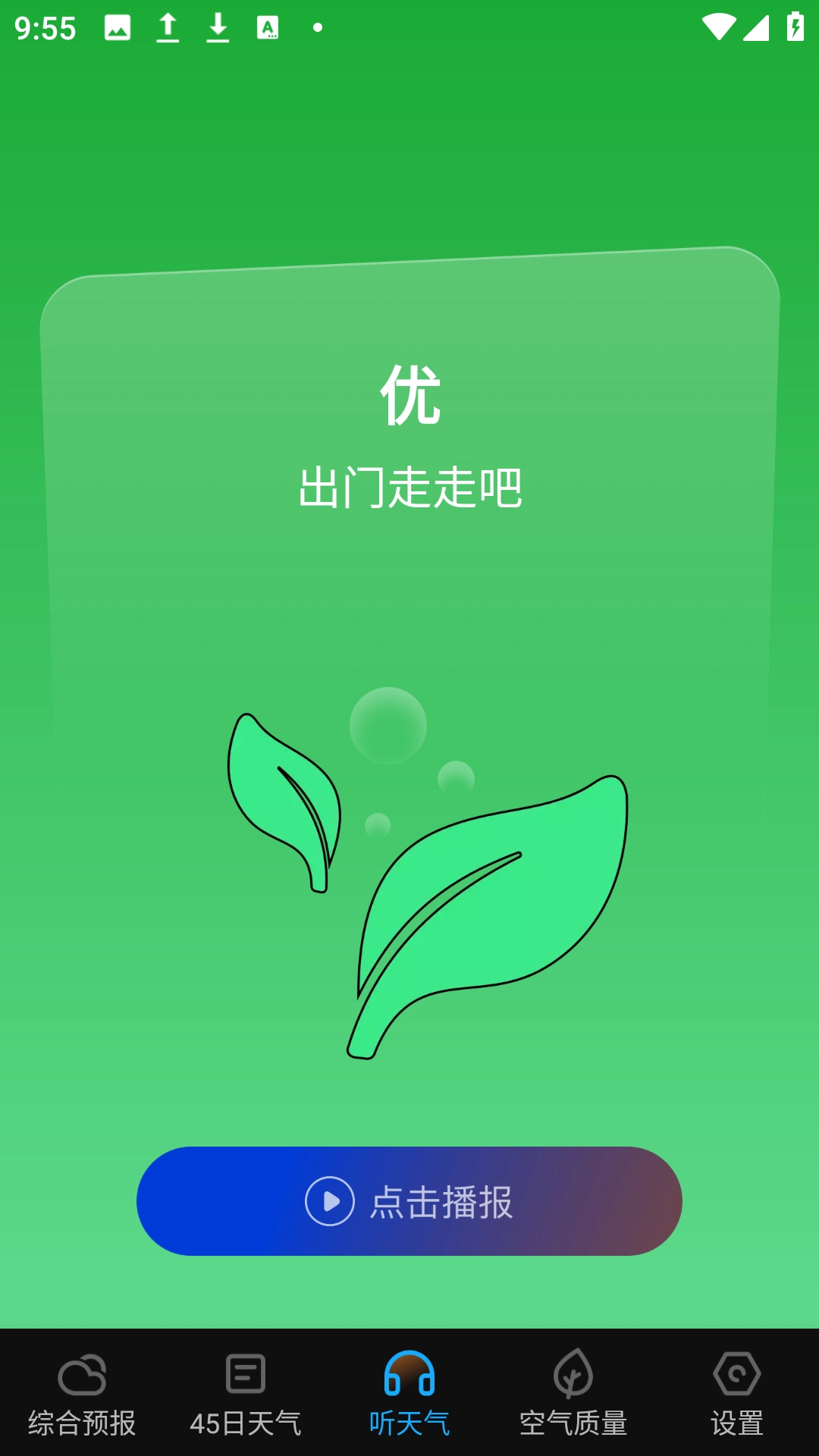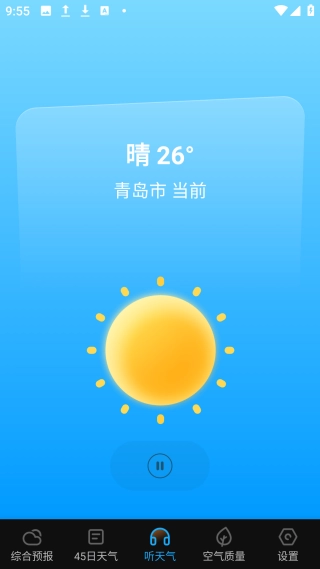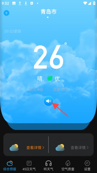 4、点击【播报天气】图标,跳转【听天气】界面,即可听当前天气播报。