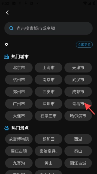2、定位当前位置或添加推荐的热门城市和景点,还可以搜索添加心仪城市。