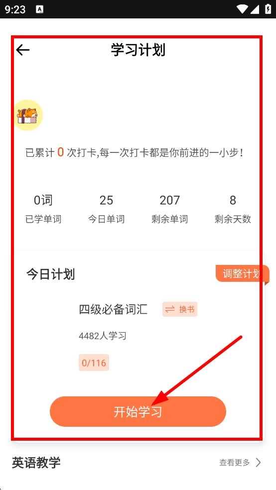 2、在学习计划页面,点击开始学习,开启英语学习。