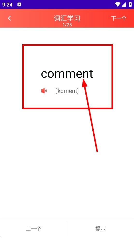 3、进入词汇学习页面,可学习单词,如comment,还能查看其音标等内容。